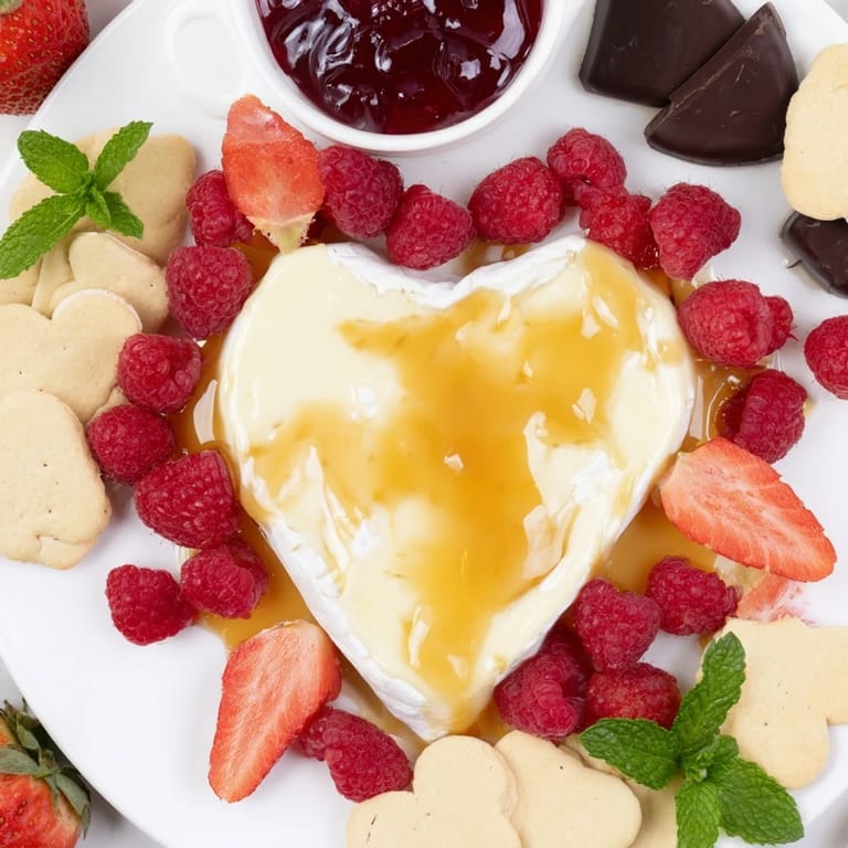 Merken Ein romantisches Vorspeisenbrett mit cremigem Brie, Fruchtaufstrichen, frischem Obst und Crackern – perfekt, um es am Valentinstag mit jemand Besonderem zu teilen.