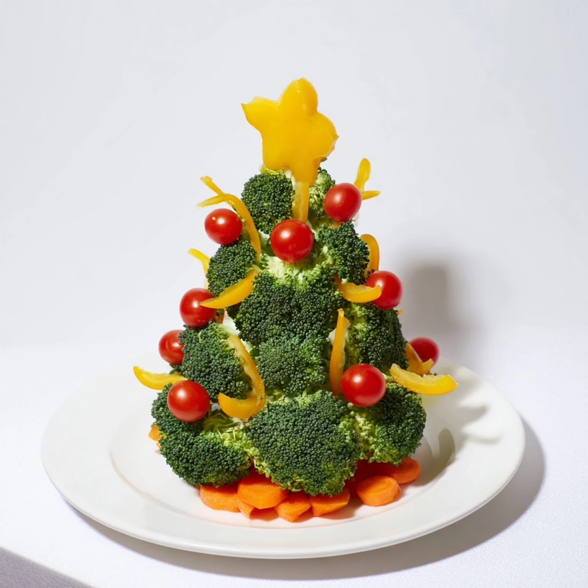 Merken Ein verspieltes und gesundes Partygericht mit Brokkoli-Röschen, die als festlicher Baum angeordnet sind und mit leuchtenden Kirschtomaten als Schmuck verziert werden. Perfekt für Feiertagsfeiern oder als Snack für Kinder.