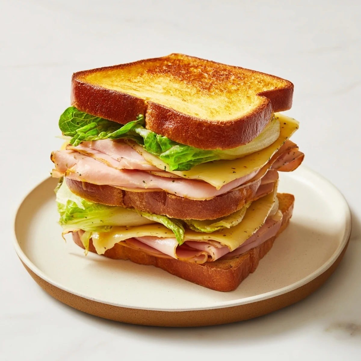 - Geräucherter Schinken, Comté-Käse, Salat und etwas Dijon-Senf auf dem ersten Drittel der Sandwiches schichten.