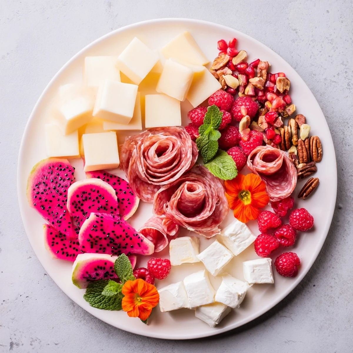 Kombinieren Sie cremige Käse, würzige Wurstwaren und frische Früchte, um verschiedene Geschmacksschichten zu schaffen.