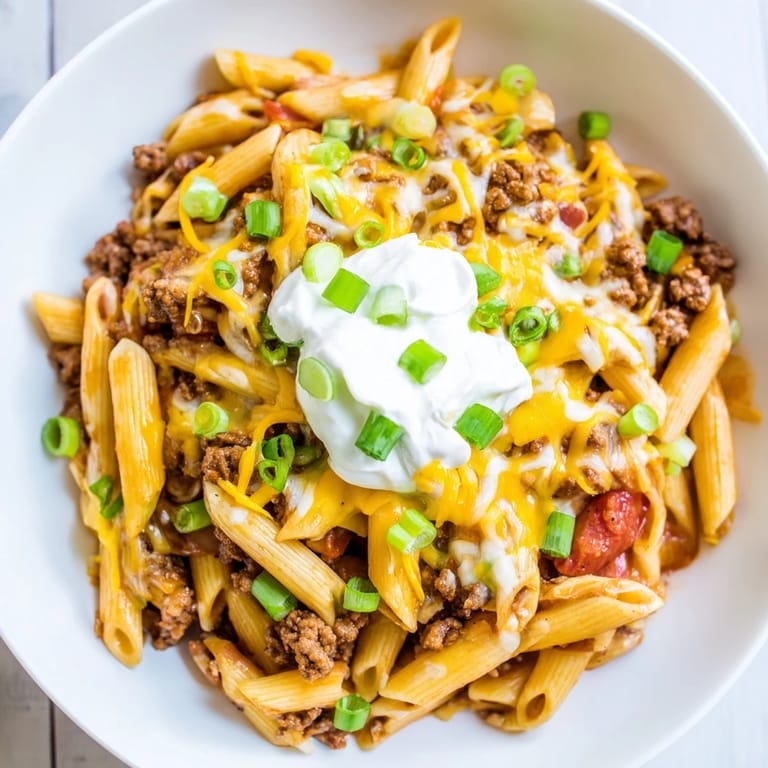 Die Kombination aus Pasta, würziger Sauce und geschmolzenem Cheddar sorgt für ein ausgeglichenes Geschmackserlebnis. Optional können frische Kräuter und Sauerrahm als Toppings den Genuss abrunden.