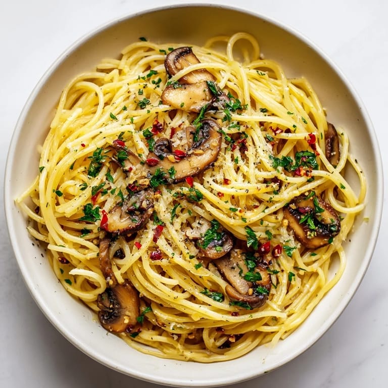 Merken Ein schnelles und geschmackvolles italienisches Pastagericht mit sautiertem Knoblauch, Olivenöl und erdigen Pilzen, perfekt für ein Abendessen unter der Woche.