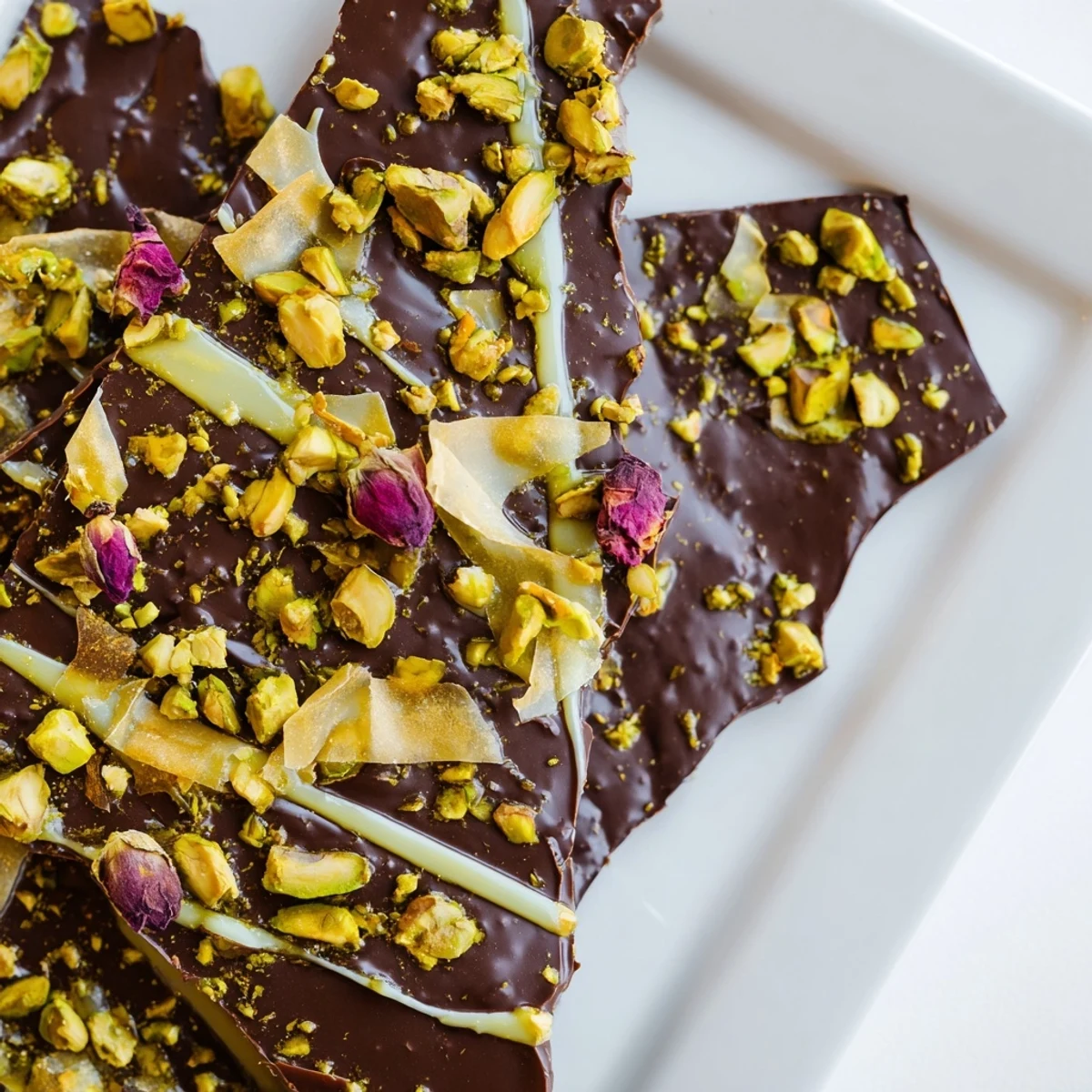 - Während die Schokolade noch weich ist, verteile die Filetechips darauf und drücke sie sanft an. Streusel dann großzügig die gehackten Pistazien über alles.