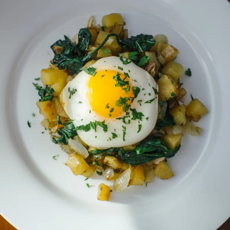 Merken Ein herzhaftes vegetarisches Pfannengericht mit goldbraun gebratenen Kartoffeln, zartem Spinat und perfekt gebratenen Spiegeleiern. Einfach, sättigend und ideal für ein schnelles Abendessen unter der Woche.
