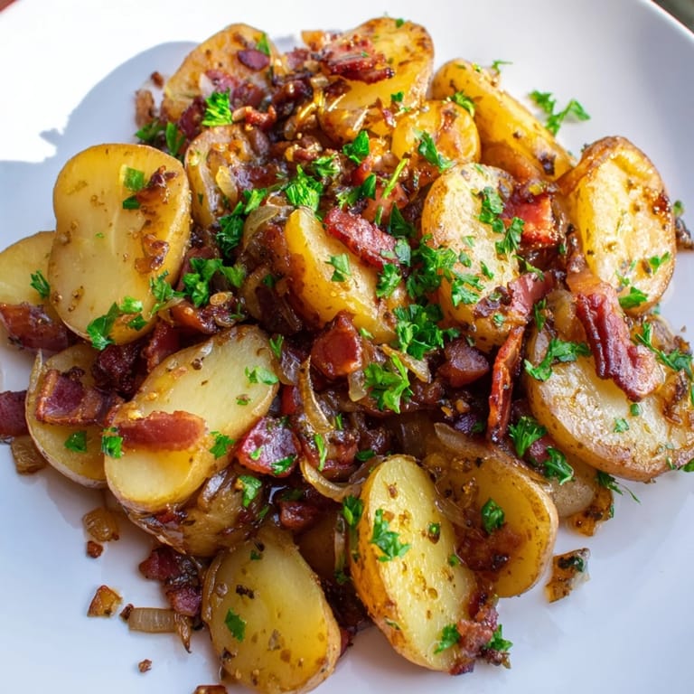 Merken Ein klassischer deutscher Kartoffelsalat wird warm serviert und besteht aus zarten Kartoffeln, die in einem würzigen Speck-Vinaigrette versetzt sind – ganz ohne Mayonnaise. Perfekt als herzhaftes Beilagengericht zu jeder Mahlzeit.