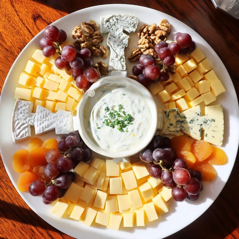 Die Platte wird in vier Quadranten aufgeteilt, in denen die einzelnen Käsesorten platziert werden, während der Dip in der Mitte steht. Lücken werden mit Früchten und Nüssen gefüllt.
