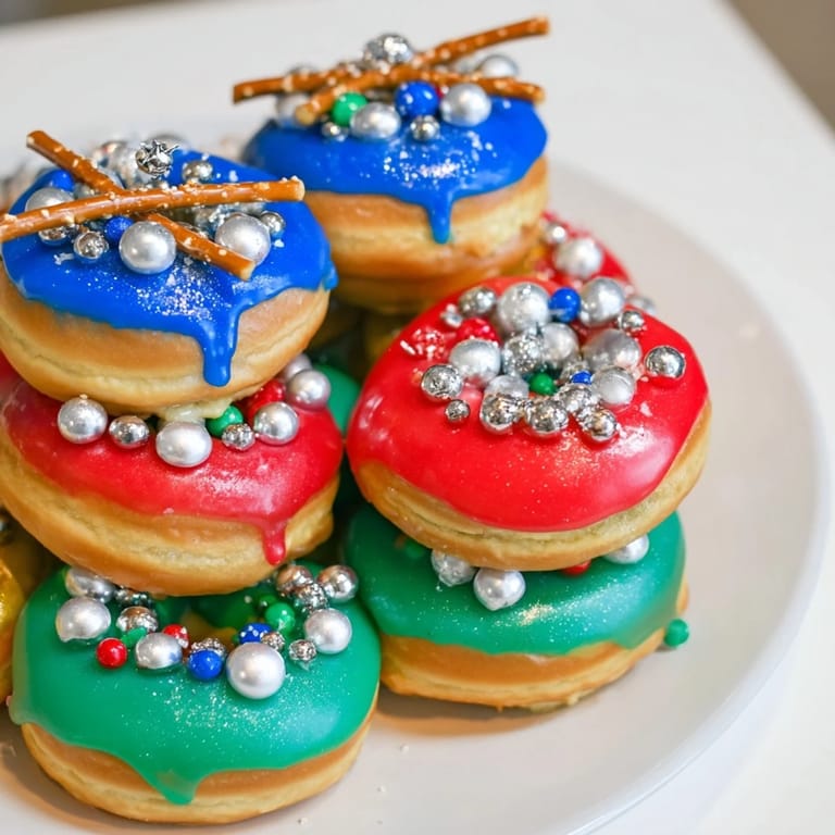 Merken Ein verspieltes und festliches Dessert-Mittelstück mit gestapelten Mini-Donuts, dekoriert wie bunte Weihnachtskugeln. Perfekt für Weihnachtsfeiern kombiniert dieser essbare Turm süße Aromen mit auffälliger Feiertagsstimmung.
