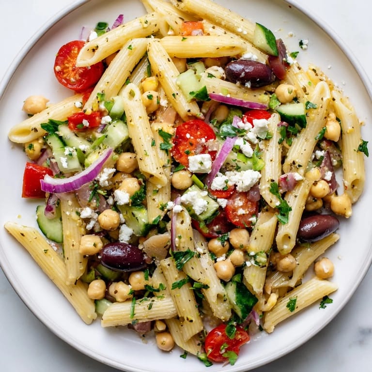 Wenn du mehr Protein brauchst, füge gegrilltes Hähnchen oder Thunfisch hinzu – das macht ihn noch sättigender. Für eine vegane Version tausche den Feta gegen pflanzlichen Käse oder lass ihn einfach weg und füge mehr Oliven hinzu. Ich habe auch schon Rucola oder Babyspinat untergemischt, das gibt eine schöne Frische und macht den Salat noch grüner. Glutenfreie Pasta funktioniert genauso gut, achte nur darauf, sie nicht zu lange zu kochen.