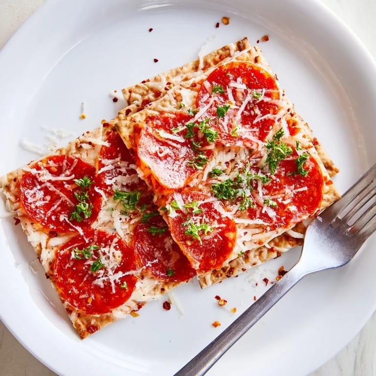 Merken Ein schneller und unwiderstehlicher Snack mit würzigen Pepperoni-Scheiben, auf knusprigen quadratischen Crackern geschichtet und mit geschmolzenem Käse für den perfekten Partyhappen bedeckt.