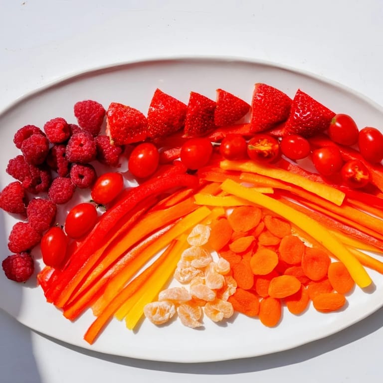 Jede Farbe auf dieser Platte bringt nicht nur Schönheit mit, sondern auch eine andere Nährstoffgeschichte. Die roten Tomaten bringen Lycopin, die orangen Paprikas bringen Beta-Carotin, das gelbe Obst bringt Vitamin C – es ist ein wissenschaftliches Kunstwerk, das zufällig auch gesund ist. Je mehr Farben auf deinem Teller sind, desto breiter ist dein Nährstoffspektrum, und das ist kein Zufall, es ist Biologie, die Schönheit mit Gesundheit verbindet.